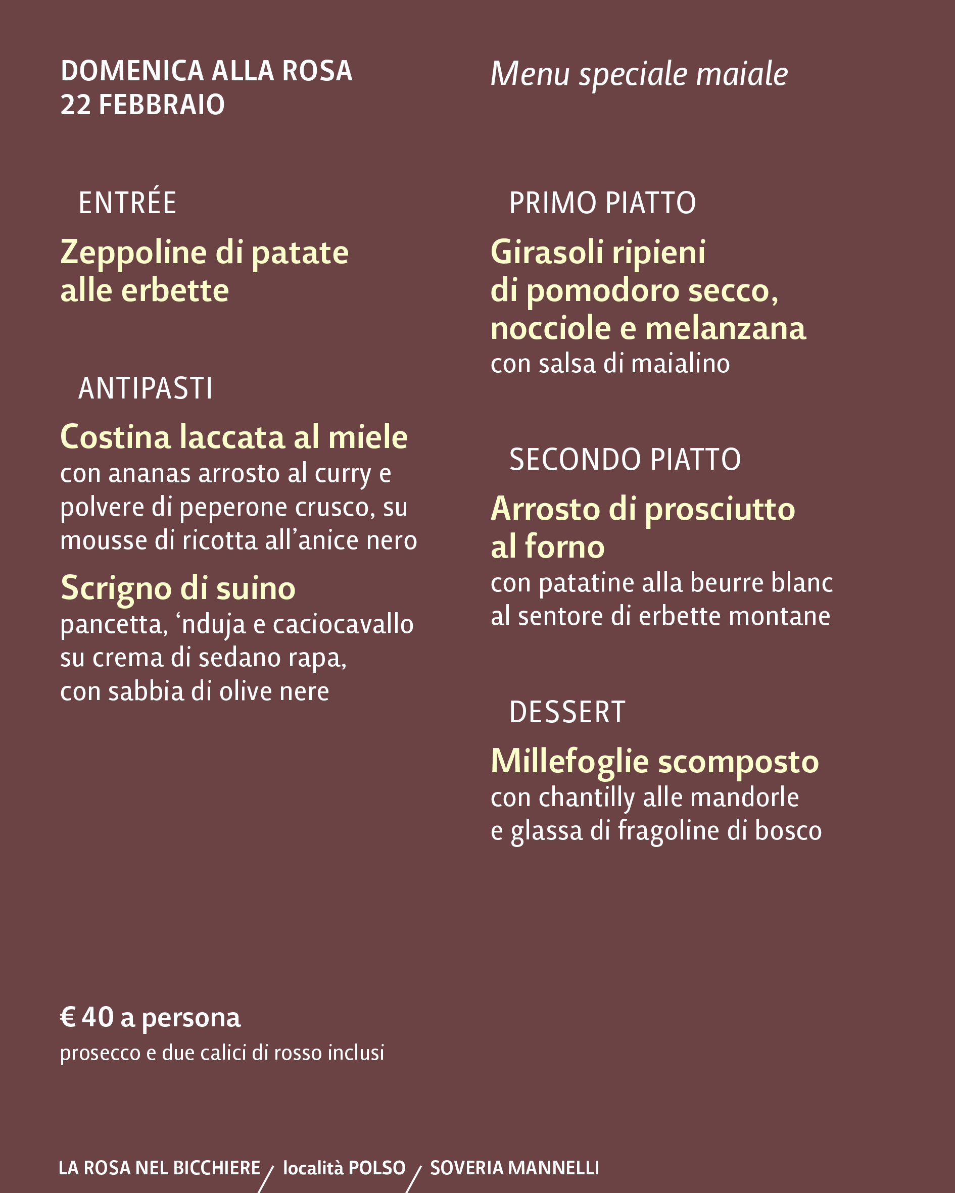 Una domenica dedicata al maiale, protagonista della cucina contadina e delle cotture lente.Un percorso che attraversa affumicature, laccature, arrosti e contrasti aromatici, tra erbette montane, spezie e richiami dolci-sapidi.Un menù intenso, caldo, pensato per essere condiviso e accompagnato da calici che ne esaltano la profondità.